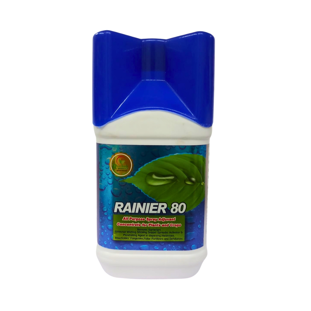 RAINIER 80 is a powerful non-ionic surfactant, designed as a universal wetting, sticking, super spreader, activator, and penetrating agent. It enhances the effectiveness of herbicides, insecticides, fungicides, foliar fertilizers, and defoliators by improving their dispersion on plant surfaces. This product is ideal for achieving uniform application and maximizing coverage, especially on hard-to-wet surfaces.